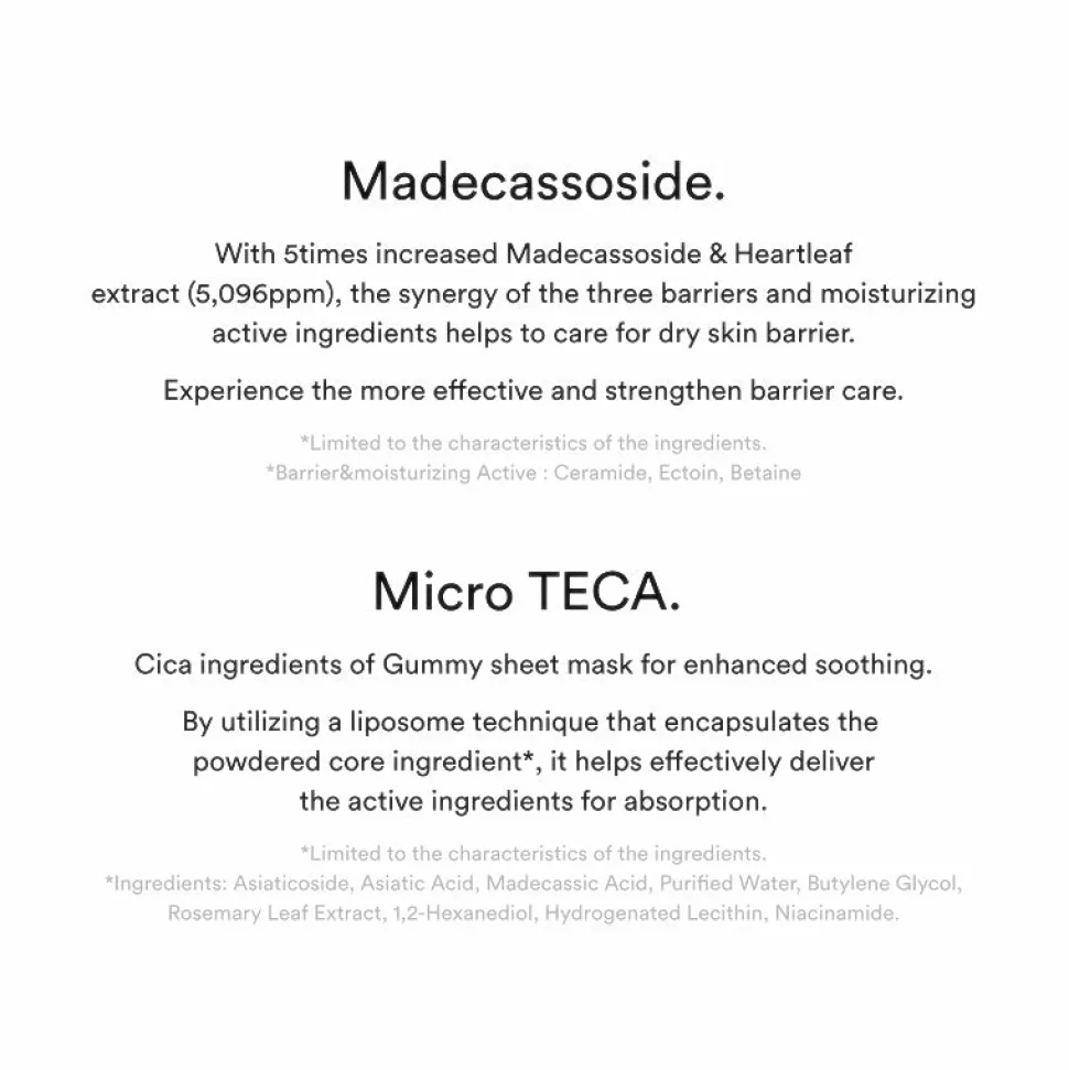 Gummy Sheet Mask Madecassoside Sticker on ihoa rauhoittava ja sen suojamuuria korjaava hydrogeelinaamio kaikille ihotyypeille – tämä rohtosammakonputkiuutetta ja keramideja sisältävä kangasnaamio auttaa lieventämään ärtyneen ihon punoitusta ja kuumoitusta, auttaen samalla korjaamaan ja vahvistamaan stressaantuneen ihon suojamuuria ja vastustuskykyä.