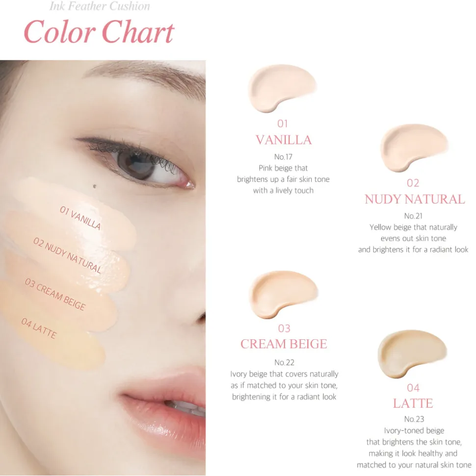 Ink Feather Cover Lasting Cushion on höyhenen kevyt meikkivoide (cushion foundation), joka tarjoaa pitkäkestoisen semi-matan lopputuloksen ja ihoa hellivien ainesosien lisäksi korkean SPF50+ PA++++ UV-suojan – tämä seerumimaisen kevyt meikkivoide tuntuu kasvoilla ilmavan hengittävältä ilman pelkoa tahmaiseta, kuivasta tai kakkumaisesta lopputuloksesta!