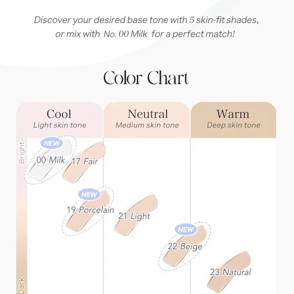 #00 Milk (Base Enhancer) : Monikäyttöinen valkoinen peiteväri, jota voi käyttää mm. muuhun peiteväriin/ meikkivoiteeseen sekoitettuna kirkastamaan sen sävyä, poskipunan alla luomaan siitä kirkkaamman ja pitkäkestoisemman, sekä luonnollisena highlighter -korostusvärinä
