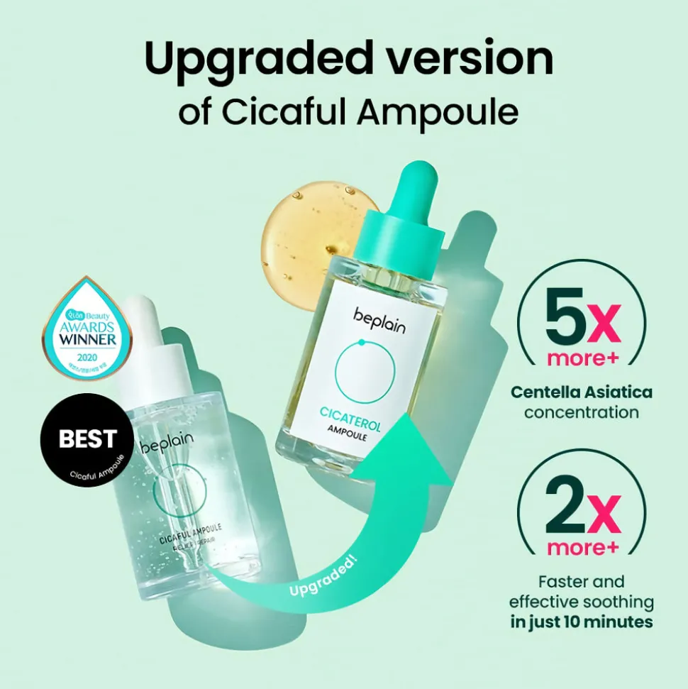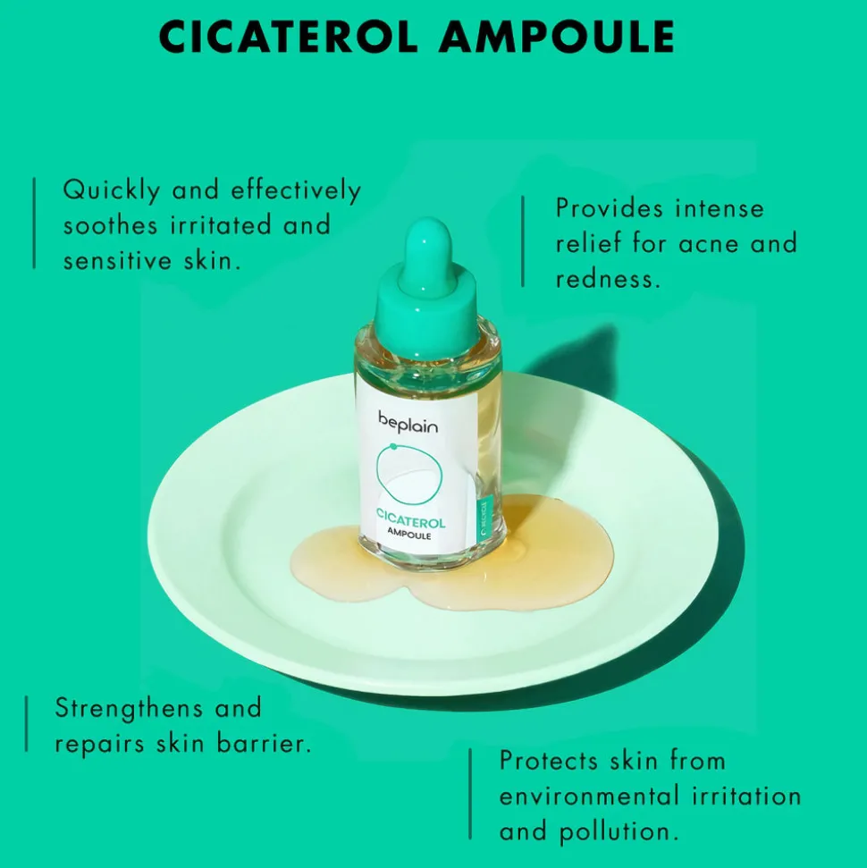 Palkittu Beplain Cicaterol Ampoule on hellävarainen, ihoa rauhoittava, korjaava ja vahvistava ampulli etenkin rasvoittuvalle, epäpuhtauksiin taipuvalle ja sekaiholle, joka kärsii usein punoituksesta ja ihoärsytyksestä – tämä raikas ampulli auttaa tasapainottamaan liiallista talin tuotantoa täyttäen samalla ihon vesikosteudella ilman pelkoa öljyisestä tai tukkoisesta tunteesta!