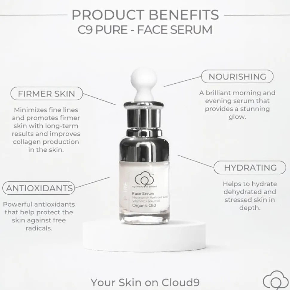C9 Pure – Face Serum on ihoa syväkosteuttava, vahvistava ja juonteita hoitava seerumi kaikille ihotyypeille, etenkin kuivalle ja ikääntyvälle iholle – tämä ihoystävällinen, täyteläisen paksu seerumi auttaa pitämään ihon kosteutettuna ja hehkuvana pitkään, jättäen jälkeensä lasimaisen glass-skin ihon!