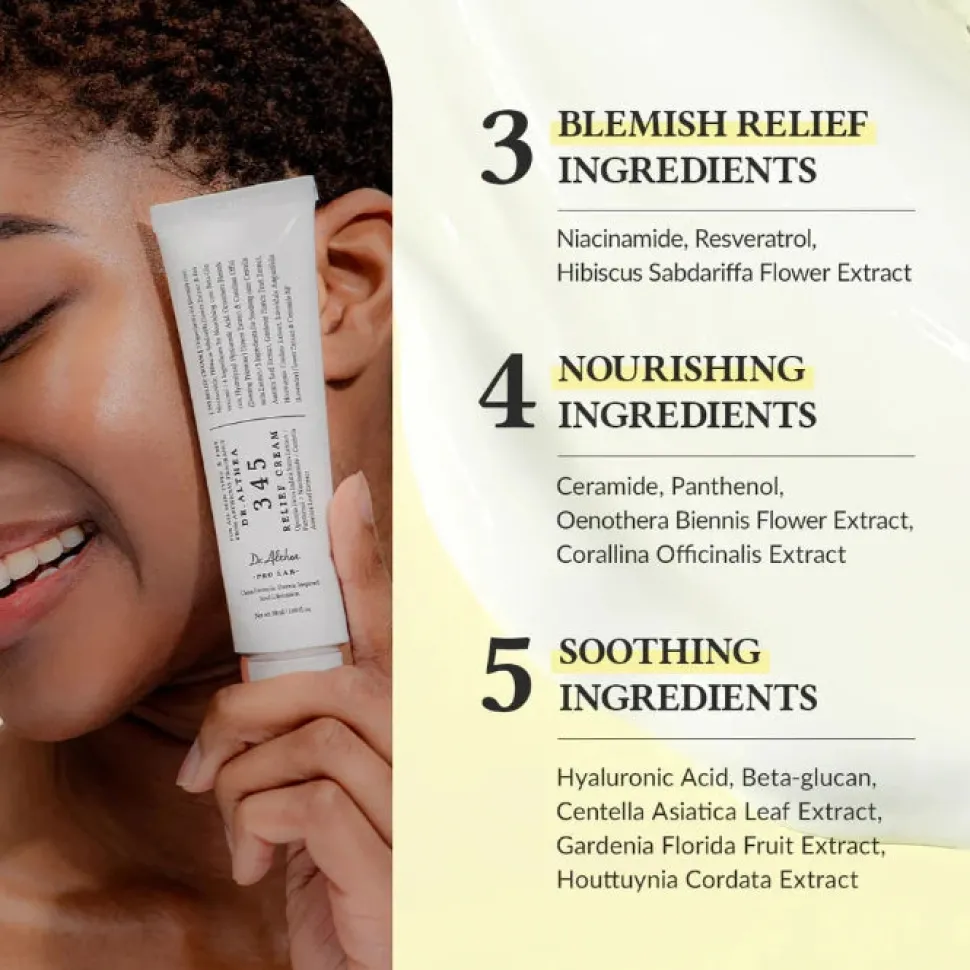 345 Relief Cream on ihoa rauhoittava, kirkastava ja korjaava kevyt kosteusvoide, joka on luotu tasapainottamaan herkkää ja epäpuhtauksiin taipuvaista ihoa finnien flare-up -jakson jälkeen – tämä hellävarainen kasvovoide tuntuu iholla miellyttävältä, imeytyen nopeasti ilman öljyistä tai tukkoista tunnetta!