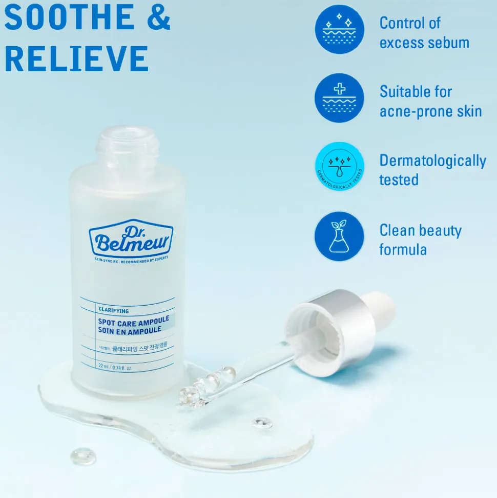 Dr. Belmeur Clarifying Spot Care Ampoule on ihon ongelma-alueita rauhoittava ja tasapainottava täsmähoito-ampulli etenkin rasvoittuvalle, epäpuhtauksiin taipuvalle ja sekaiholle, joka kärsii usein myös herkkyydestä – tämä ihoystävällinen ampulli auttaa edistämään pienten pintatulehdusten, kuten finnien, paranemisprosessia, kontrolloimaan ongelma-alueiden (mm. t-alueen) liikaöljyisyyttä sekä tasapainottamaan ihon öljy-vesi tasapainoa!