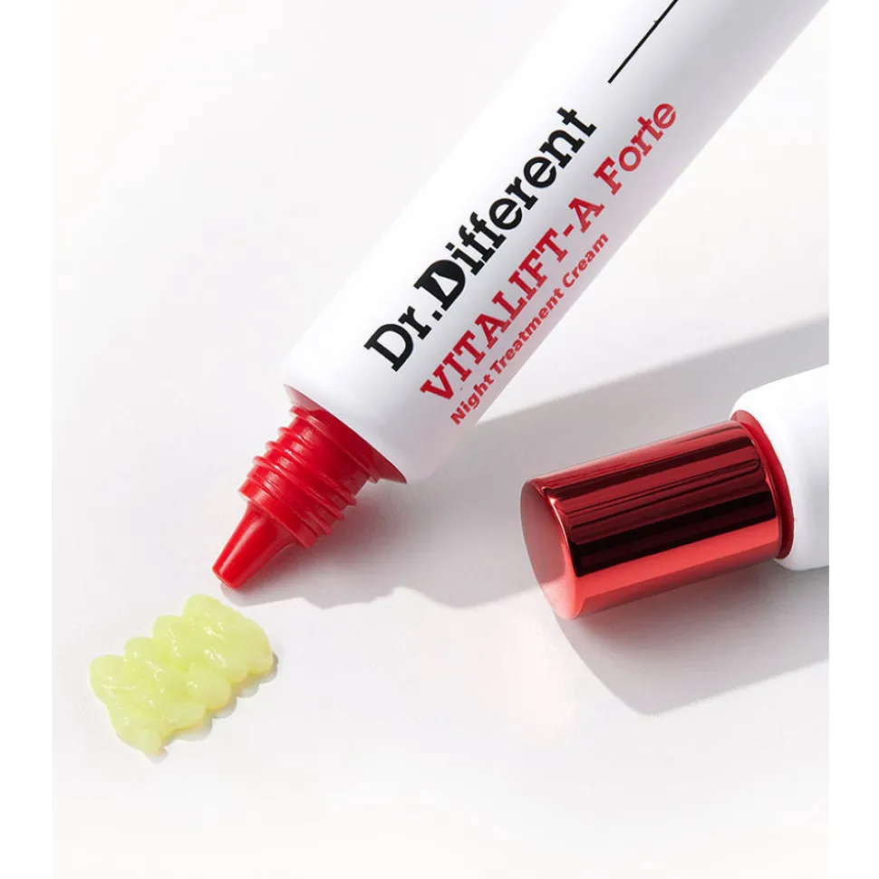 Palkittu Dr.Different VITALIFT-A Forte on ihon joustavuutta edistävä, ravitseva ja kirkastava 0.1% retinalia sisältävä yövoide kaikille ihotyypeille, etenkin ikääntyvälle iholle joka kärsii karheasta tekstuurista ja pigmenttimuutoksista. VITALIFT-A Forte -yövoide auttaa tehokkaasti häiventämään ja ennaltaehkäisemään juonteita, pehmentämään ihon tekstuuria, kirkastamaan pigmenttimuutoksita, sekä luomaan ihosta täyteläisemmän ja elinvoimaisemman.
