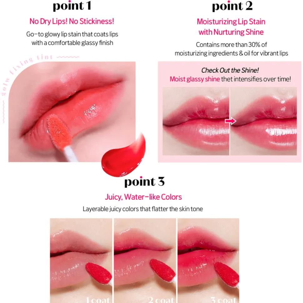 Etude Glow Fixing Tint on kosteuttava huulisävyte, jonka vesimäisen kevyt koostumus luo huulille mehukkaan sävyn lisäksi herkullisen lasimaisen kiillon joka muuttuu päivän aikana huulilla vieläkin intensiivisemmäksi – tämä vegaaninen huulisävyte pysyy huulilla läpi päivän ilman tahmaista tunnetta, jättäen pois kuluessaan jälkeensä luonnollisen sävytahran (lip stain) ♡