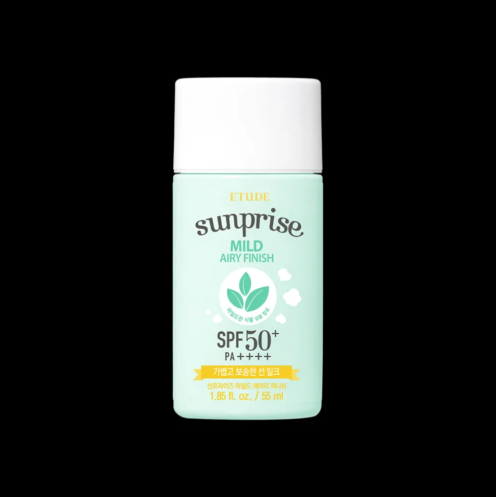 Etude Sunprise Mild Airy Finish Sun Milk on kevyt mineraaliaurinkovoide suojakertoimella SPF50+ PA++++. Aurinkovoiteessa on 100% fysikaalinen filtteri (sinkkioksidi), ja ilmavan koostumuksensa ansiosta aurinkosuoja tuntuu miellyttävältä iholla.
