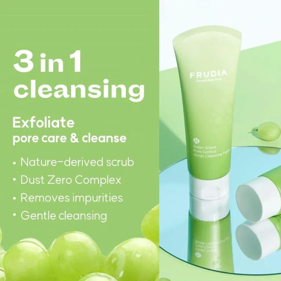 Green Grape Pore Control Scrub Cleansing Foam on syväpuhdistava ja hellävaraisesti kuoriva puhdistusvaahto, joka sisältää vihreiden viinirypäleiden uutetta. Vihreät viinirypäleet sisältävät tanniinia, joka on tehokas poistamaan kuollutta ihosolukkoa ja epäpuhtauksia.