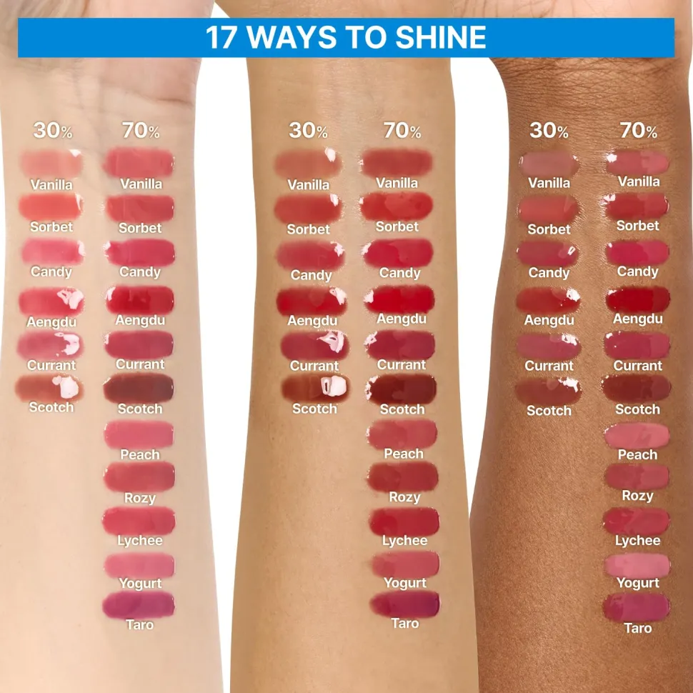 Hoitava huulikiilto sopii kaikille, jotka haluavat yhdistää volyymia korostavan 3D-efektin, pitkäkestoisen kosteutuksen ja kiiltävän, säihkyvän lopputuloksen. Saatavilla sävyjä 30 % pigmentillä luonnolliseen lopputulokseen tai 70 % pigmentillä intensiivisempään väriin.