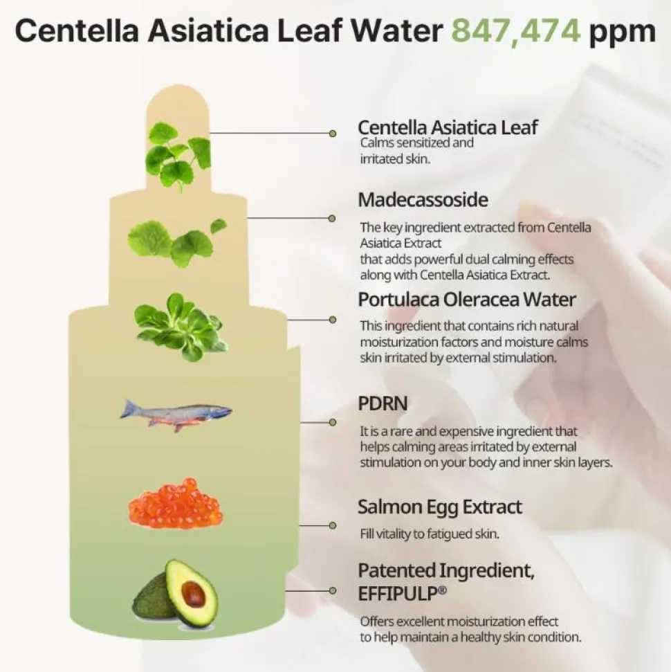 Yleellinen lohenmäti, rohtosammakonputkiuute ja pantenoli auttavat tehokkaasti lievittäämään ihon punoitusta ja ärtyneisyyttä. Antioksidanttipitoinen ampulli sisältää myös hyaluronihappoa, lehtivihreää ja madecassosidia tarjoamaan iholle kestävyyttä ja suojaa luoden siitä samalla täyteläisemmän.