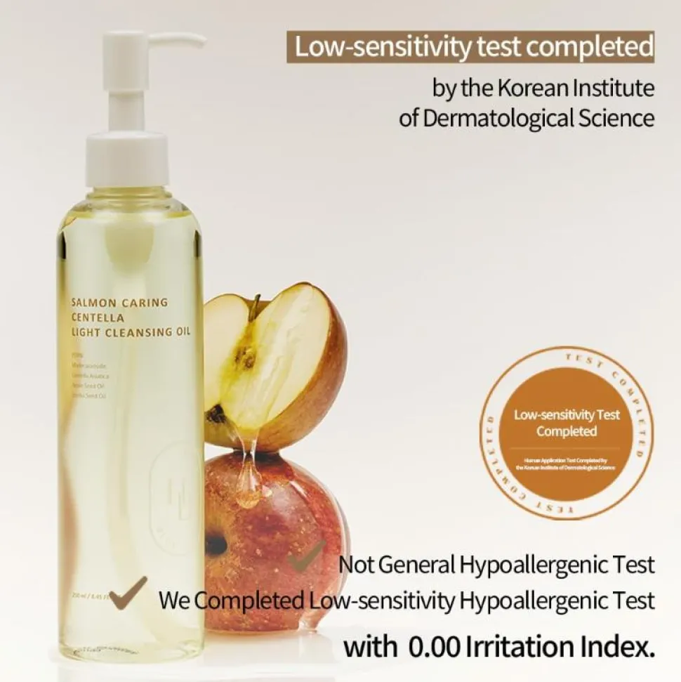 Salmon Caring Centella Light Cleansing Oil on mieto ja hellävarainen öljypuhdistusaine kaikille ihotyypeille – tämä palkittu puhdistusöljy sisältää rasittunutta ihoa elävöittävää PDRN:ää ja lohenmätiä sekä runsaasti rauhoittavaa rohtosammakonputkiuutetta, jotka auttavat pitämään ihon tasapainoisena puhdistuksen yhteydessä.