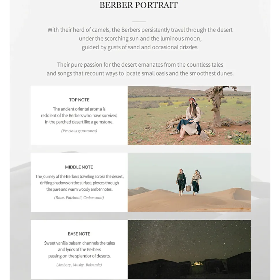 Matkusta aavikon silkkisille dyyneille Huxleyn Berber Portrait -parfyymin matkassa – tässä kiehtovassa hajuvedessä yhdistyvät lämpimän puun, makean vanilja-balsamin ja muinaisten mineraalien aromaattiset tuoksut, jotka saavat aistisi vaeltamaan kauas lämpimään ♡