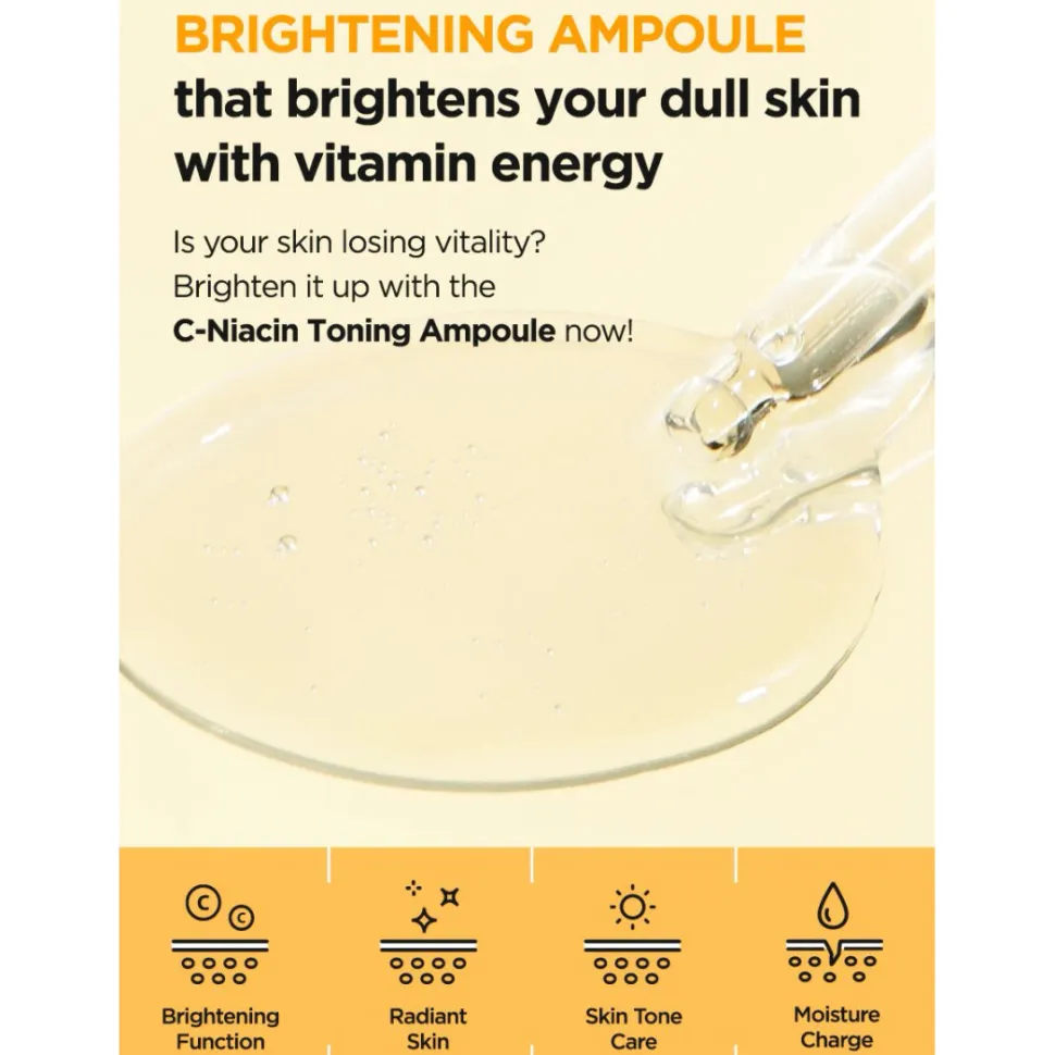 Isntree C-Niacin Toning Ampoule on hellävarainen – ihoa tehokkaasti kirkastava ampulli, etenkin samealle- ja väsyneelle iholle – ja iholle, joka on taipuvainen pigmenttimuutoksiin.