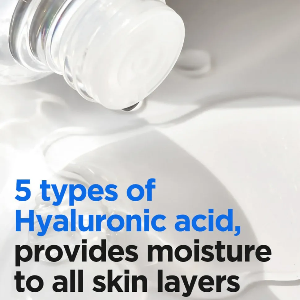 Kasvovesi sisältää viittä eri hyaluronihappoa, jotka imeytyvät ihon eri kerroksiin päivän mittaan – auttaen ihoa pysymään kosteutettuna koko päivän, sekä rauhoittavaa aloe veraa, pantenolia ja beetaglukaania lievittämään ihoärsytystä ja punoitusta.