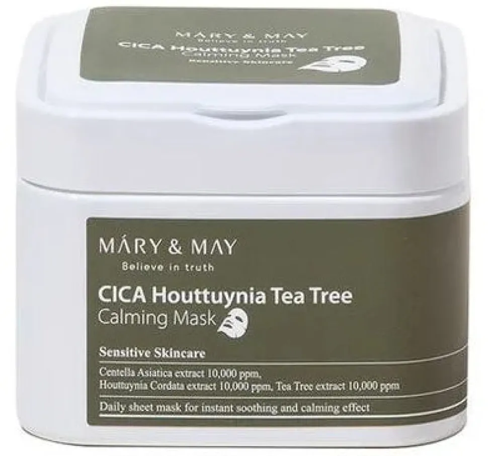 Mary&May CICA Houttuynia Tea Tree Calming Mask on kangasnaamiopakkaus, joka sisältää 30 naamiota ilmatiiviiseen purkkiin pakattuna. Naamiot sisältävät tehokkaita, ihoa rauhoittavia ja tulehdusta lievittäviä uutteita, jotka myös kosteuttavat ihoa ja vahvistavat sen suojaa ulkoisia ärsykkeitä vastaan.