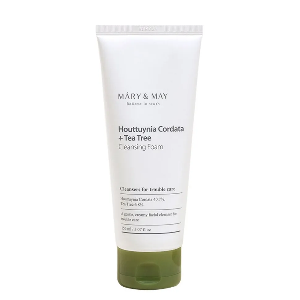 Mary & May Houttuynia Cordata + Tea Tree Cleansing Foam on herkästi ärtyvän ihon puhdistusvaahto, joka sisältää 40.7% viherkameleontinlehti- ja 6.8% teepuunlehtiuutetta. Se rauhoittaa ihoa lievittäen punoitusta, kutinaa tai pieniä ihon pintatulehduksia ja puhdistaa ihohuokoset päivän aikana kertyneestä liasta.