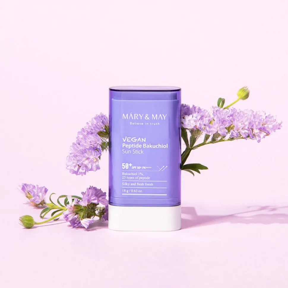 Mary&May Vegan Peptide Bakuchiol Sun Stick on vegaaninen aurinkovoidepuikko tehokkailla anti-age ominaisuuksilla. Puikko suojaa ihoa vahingoittavilta ja vanhentavilta auringon säteiltä korkealla UV-suojalla: SPF50+ PA++++.
