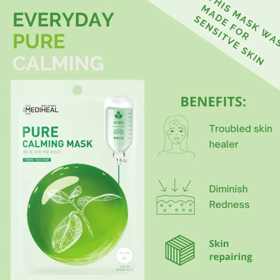 Mediheal Pure Calming Mask on ihoa tehokkaasti rauhoittava kangasnaamio kaikille ihotyypeille, etenkin ärtyneelle iholle – tämä ihoa hellivä kangasmaski sisältää antioksidanttista rohtosammakonputkiuutetta, pujo-uutetta ja allantoiinia, jotka yhdessä auttavat lieventämään stressaantuneen ihon punoitusta ja ärtyneisyyttä, tarjoten samalla raikasta kosteutusta.