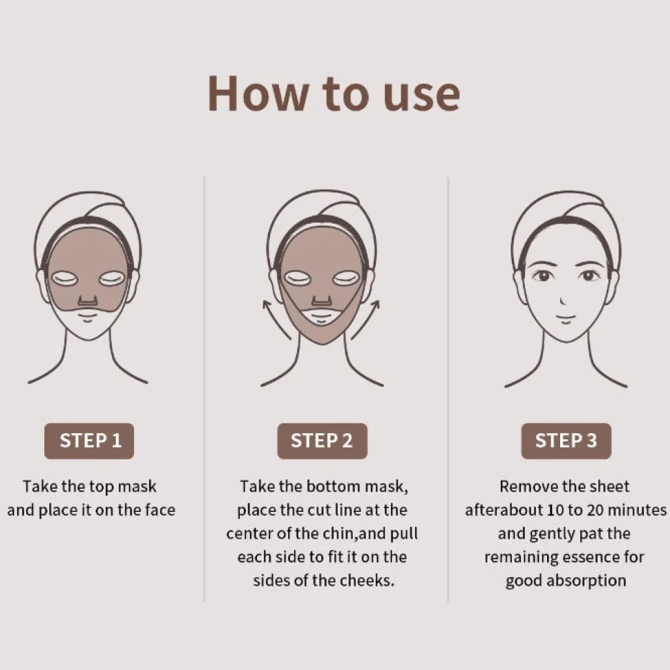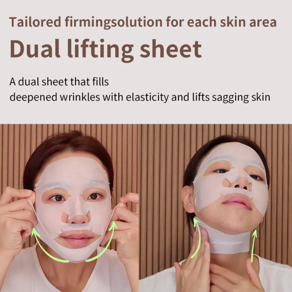 Innovatiivinen kaksiosainen kangasnaamio, joka hoitaa samanaikaisesti sekä kasvojen että kaulan ihoa. Se on kehitetty antamaan välittömän kohottavan vaikutuksen veltostuneelle iholle, vähentämään juonteita ja palauttamaan kimmoisuutta. Naamion täyteläinen mutta nopeasti imeytyvä koostumus ravitsee ihoa tehokkaasti ilman tahmeaa tunnetta.