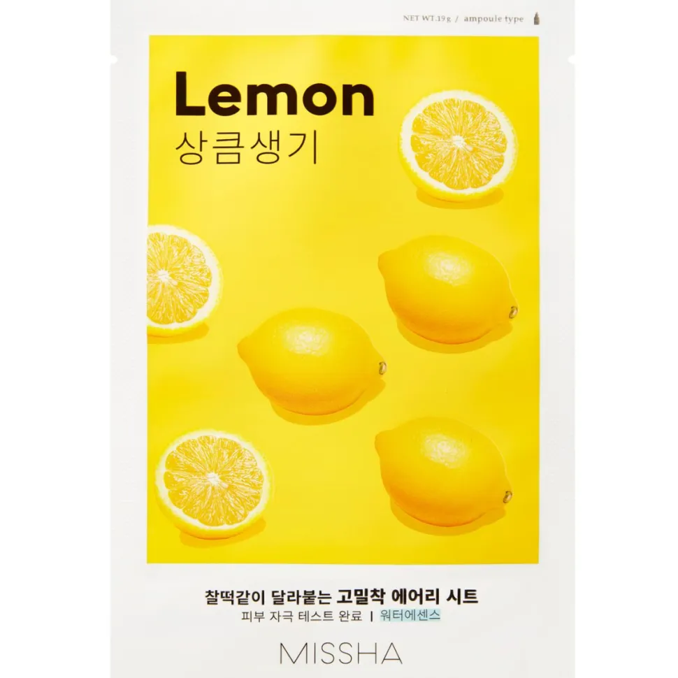Sitruunan uutetta sisältävä Missha Airy Fit Sheet mask (Lemon) -kangasnaamio kirkastaa ja kosteuttaa kasvojen ihoa. Sen sisältämä C-vitamiini on tehokas antioksidantti, joka vahvistaa ihoa ja taistelee vapaita radikaaleja sekä hyperpigmentaatio vastaan.