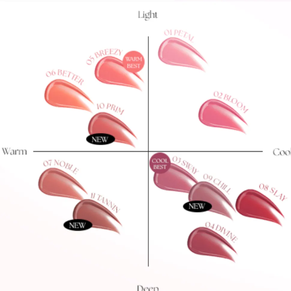 Koostumus on rikastettu yhdistelmällä eri öljyjä, joka tekee huulista täyteläiset, kosteutetut ja säihkyvän kiiltävät. Huulia hoitavat ainesosat tekevät tästä sävytteestä myös hoitavan balmin: vegaaninen kollageeni tuo täyteläisyyttä ja napakkuutta, ja Panthenol Niosome – nanoskooppinen pantenolia kapseloiva rakenne – kosteuttaa syvältä, ehkäisee kuivumista ja rauhoittaa rohtumia. Lopputuloksena on heleä ja hoitava kerros, joka suojaa huulia ulkoisilta ärsykkeiltä.