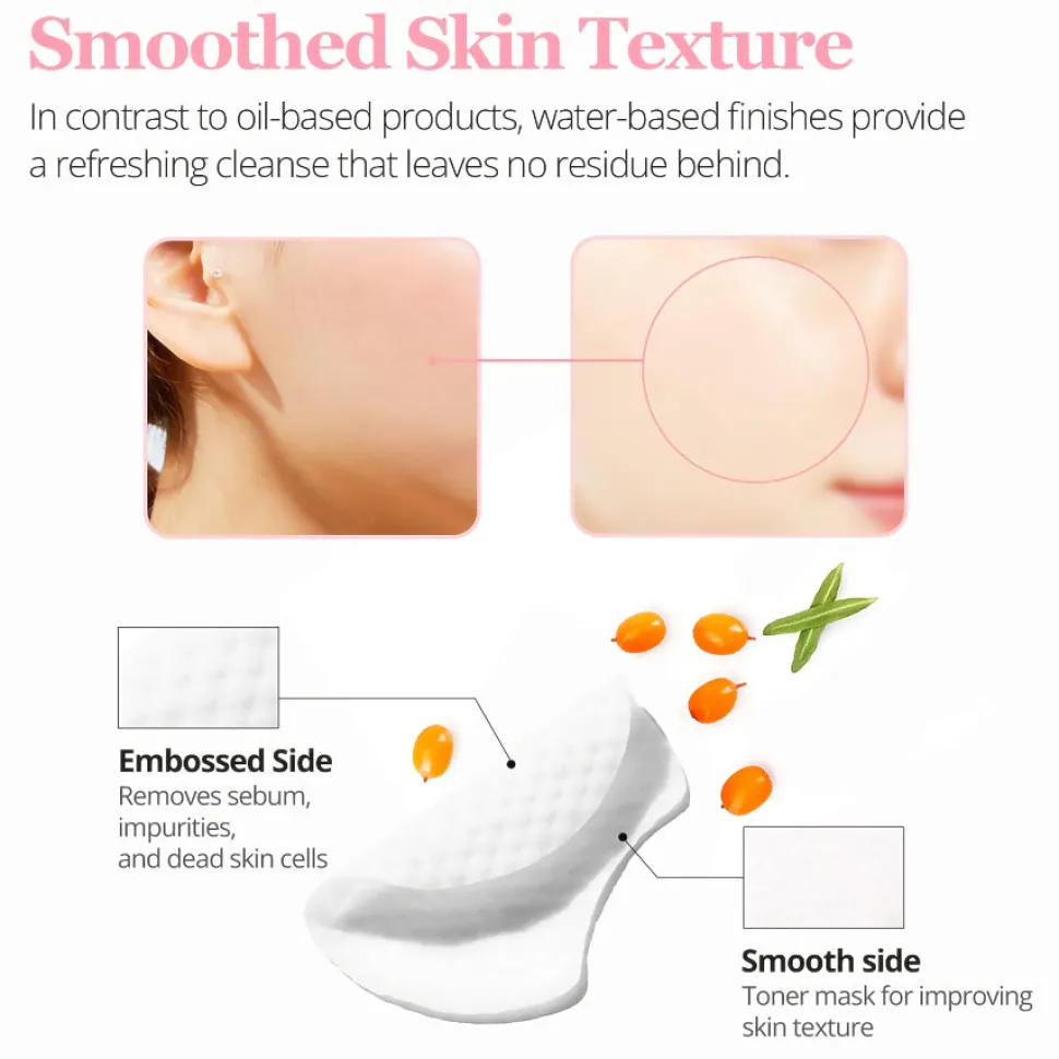 Puhdistuslaput ovat rikastettu ihoa hellivillä vitamiineilla (C-vitamiini, E-vitamiini, B5-vitamiini/ pantenoli, B3-vitamiini/ niasiiniamidi & H-vitamiini/ biotiini), rauhoittavalla tyrniuutteella sekä kuollutta ihosolukkoa erittäin hellävaraisesti kuorivalla PHA-hapolla, jotka yhdessä auttavat pitämään ihon tasapainoisena puhdistuksen yhteydessä lieventäen samalla epäpuhtauksien ja laajentuneiden ihohuokosten muodostumista – lopputuloksena on raikas, pehmeä ja heleä iho.