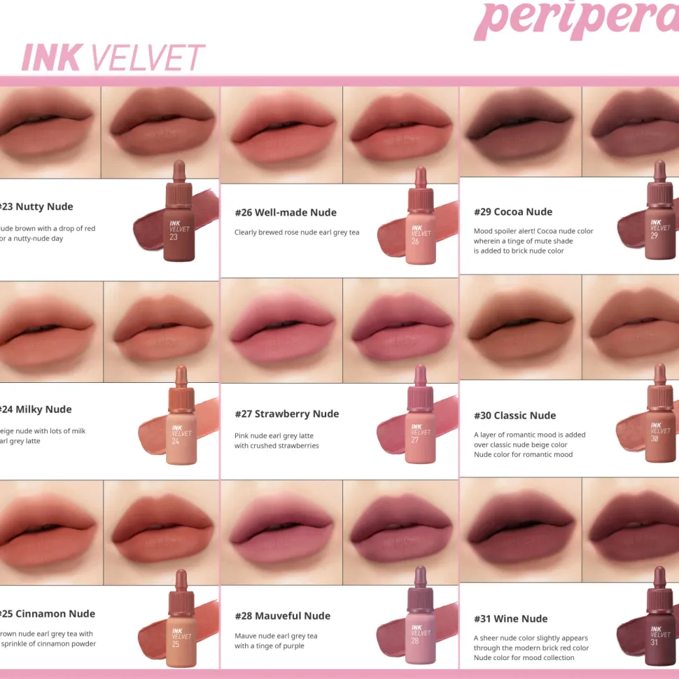 Peripera Ink Velvet Tint on samettisen mattainen – erittäin pigmenttinen ja kestävä – huulisävyte (lip tint) joka levittyy huulille pehmeästi, täyttäen samalla huulten uurteet ja luoden täyteläisen tasaisen samettisen pinnan.