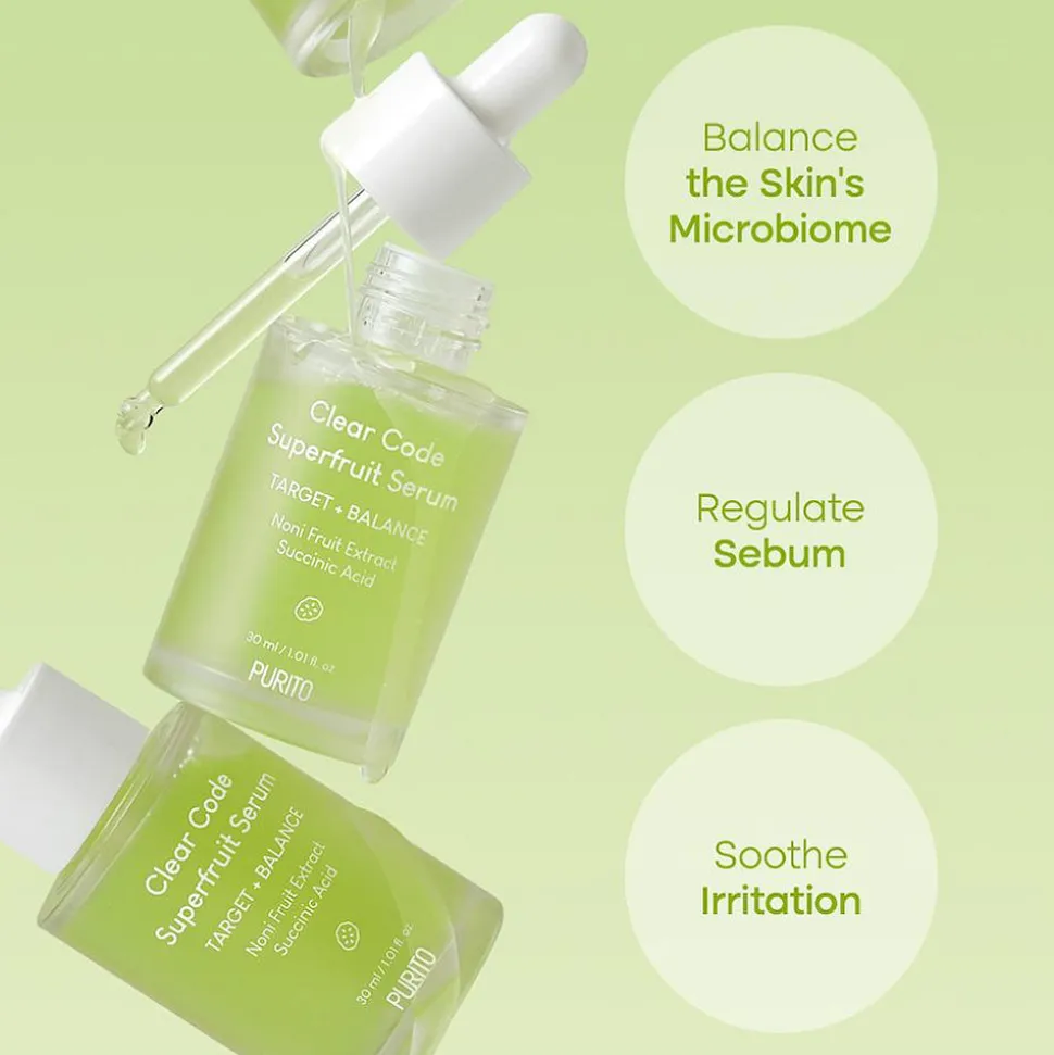 Purito Clear Code Superfruit Serum taistelee puhtaamman ja tasaisemman ihon puolesta. Se sisältää superruokana tunnettua ja erittäin vitamiinipitoista noni-hedelmän uutetta, hellävaraisesti kuorivaa happoa (meripihkahappo, sukkiinihappo) sekä ihoärsytystä lievittäviä kasviperäisiä ainesosia.