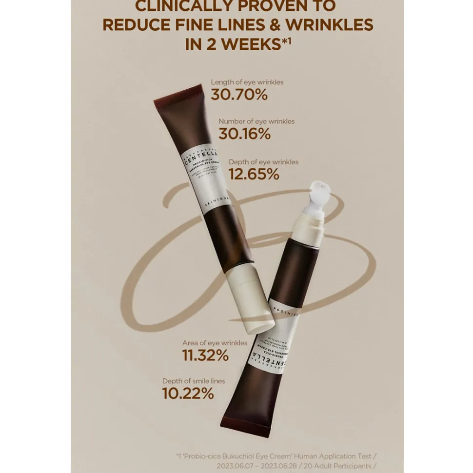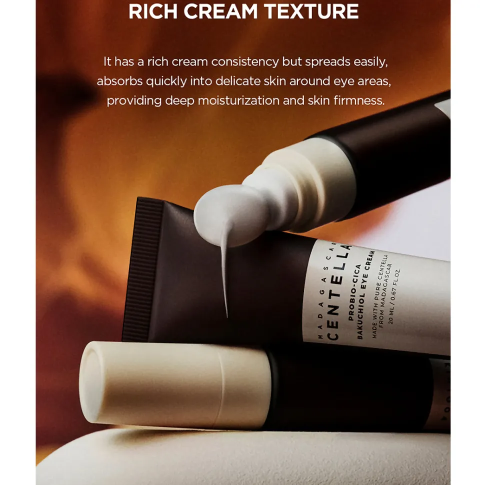 Centella Probio-Cica Bakuchiol Eye Cream on hellävarainen silmänympärysvoide – etenkin ikääntyvälle ja herkälle iholle, joka auttaa häivyttämään ihon pieniä juonteita, sekä kirkastamaan ja kosteuttamaan silmänympärysihoa.