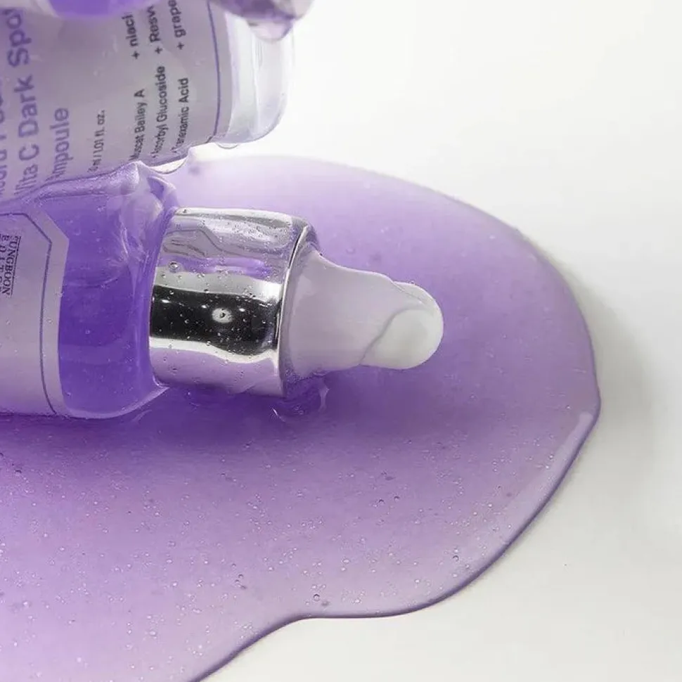 Ampullin kaunis, violetti väri on peräisin Meoru-uutteesta, mutta se ei jää näkyviin iholle – tuotteen kevyt koostumus imeytyy iholle tehokkaasti ja huomaamattomasti.
