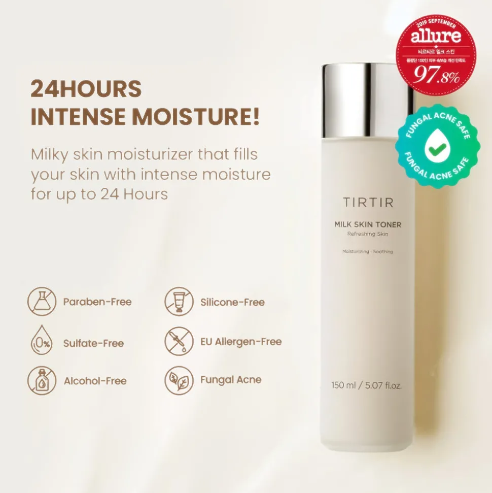 TIRTIR Milk Skin Toner on hellävarainen, ihoa tehokosteuttava ja kirkastava täyteläinen kasvovesi kaikille ihotyypeille, myös herkälle iholle – ja etenkin sinulle kuka haluat saavuttaa pitkäkestoisen kosteutuksen lisäksi lasimaisen glass skin -ihon!