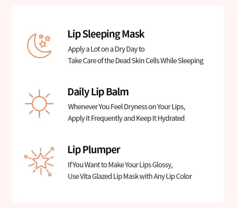 Vita Glazed Lip Mask on ravitseva huulinaamio ja plumperi samassa tuotteessa – tämä huulten ihoa kosteuttava tuote on erinomainen lahja jokaiselle, joka rakastaa kauniita ja söpöjä korealaisia tuotteita ja nauttii päivittäisestä ihonhoidosta osana kauneusrutiinejaan.
