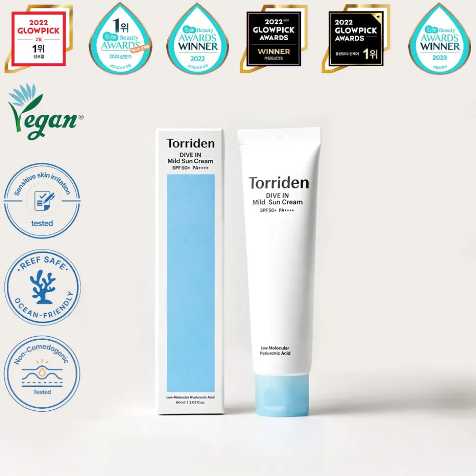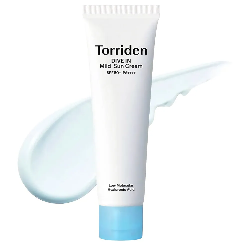 Torriden DIVE-IN Hyaluronic Acid Mild Sun Cream on lukuisia kauneuspalkintoja voittanut hellävarainen ja kosteuttava SPF50+ / PA++++ suojakertoimen fysikaalinen aurinkovoide kaikille ihotyypeille, myös herkälle ja epäpuhtauksiin taipuvalle iholle – tämä komedogeenitön ja 100% sinkkioksidi-pohjainen non-nano aurinkovoide tuntuu iholla raikkaan kevyeltä ilman tahmaista tunnetta, jättäen jälkeensä tasapainoisen kosteutetun ja luonnollisen matan lopputuloksen ärsyttämättä tai tukkimatta ihoa!