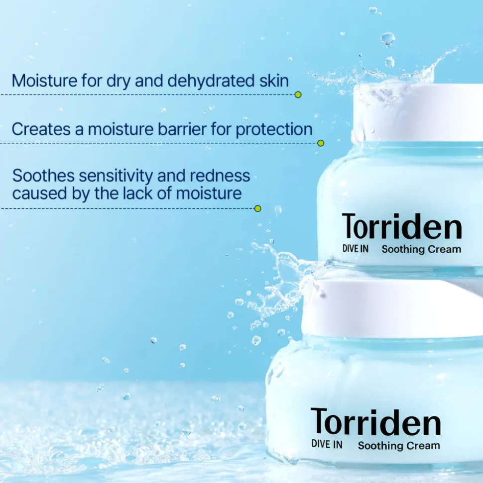 Torriden DIVE-IN Hyaluronic Acid Soothing Cream on hellävarainen, ihoa rauhoittava ja kosteuttava geelimäinen kosteusvoide kaikille ihotyypeille, myös herkälle ja rasvoittuvalle iholle – tämä palkittu geelivoide luo ihon pinnalle raikkaan kosteuskalvon, tarjoten ärtyneelle iholle viilentävää vesikosteutusta ilman tahmeaa tai tukkoista tunnetta!