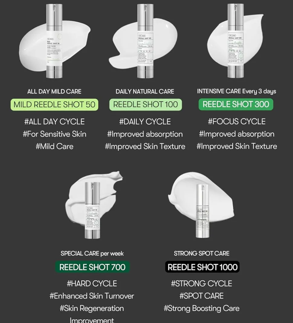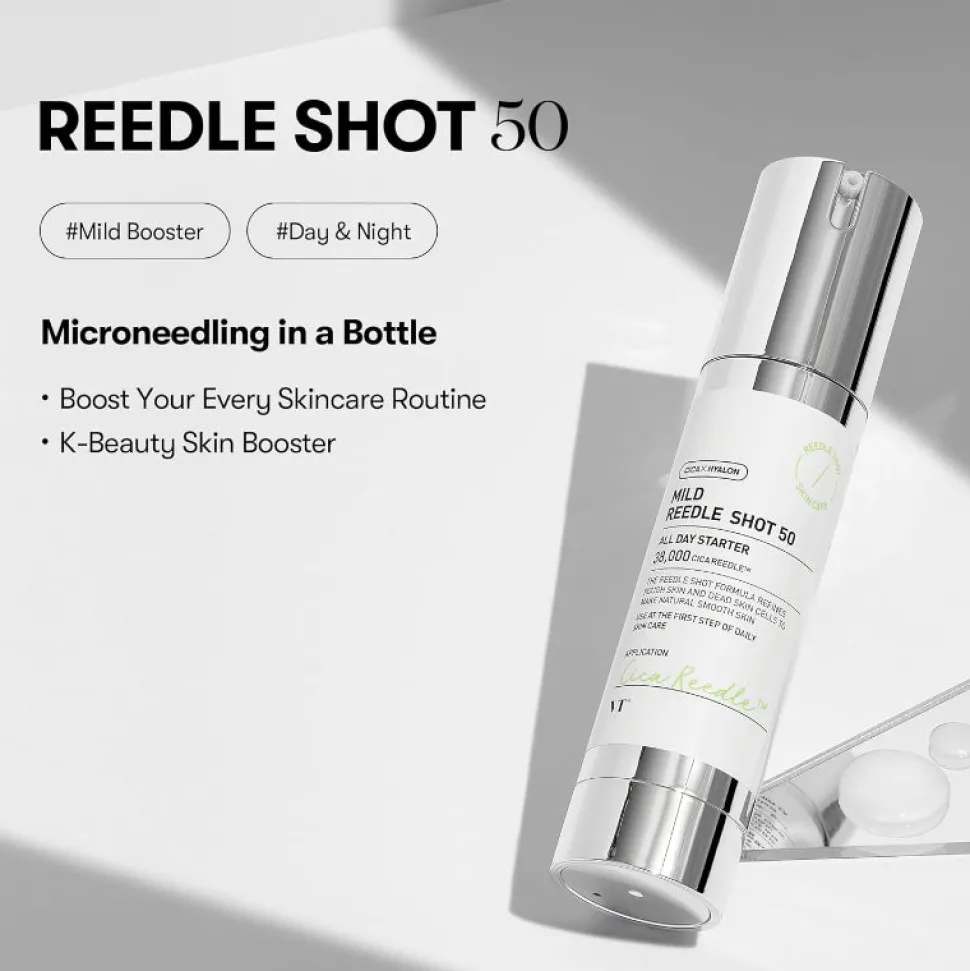 VT Cosmetics Mild Reedle Shot 50 on innovatiivinen hoitoneste, joka auttaa aktiivisten ainesosien imeytymistä ihoon edistäen ihon tekstuuria, täyteläisyyttä ja kuulautta mikroneulauksen tavoin – ilman neuloja!