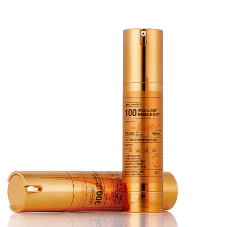 VT Cosmetics Vita-Light Reedle Shot 100 on ihoa kirkastava ja heleyttävä hoitoneste, joka edistää aktiivisten ainesosien imeytymistä ihoon parantaen ihon tekstuuria, elastisuutta ja kuulautta mikroneulauksen tavoin – ilman neuloja!