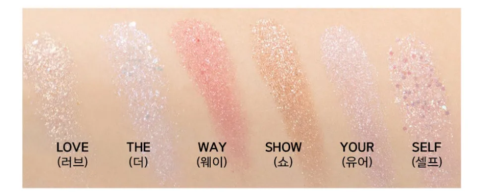 Pienempää shimmeriä sekä isompia hiutaleglittereitä sisältävä jelly-koostumus asettuu kauniisti minkä tahansa pohjasävyn päälle ja pysyy koko päivän pölyämättä. Jelly-koostumuksen vuoksi luomivärejä on helppo kerrostaa metallimaisen efektin saamiseksi.