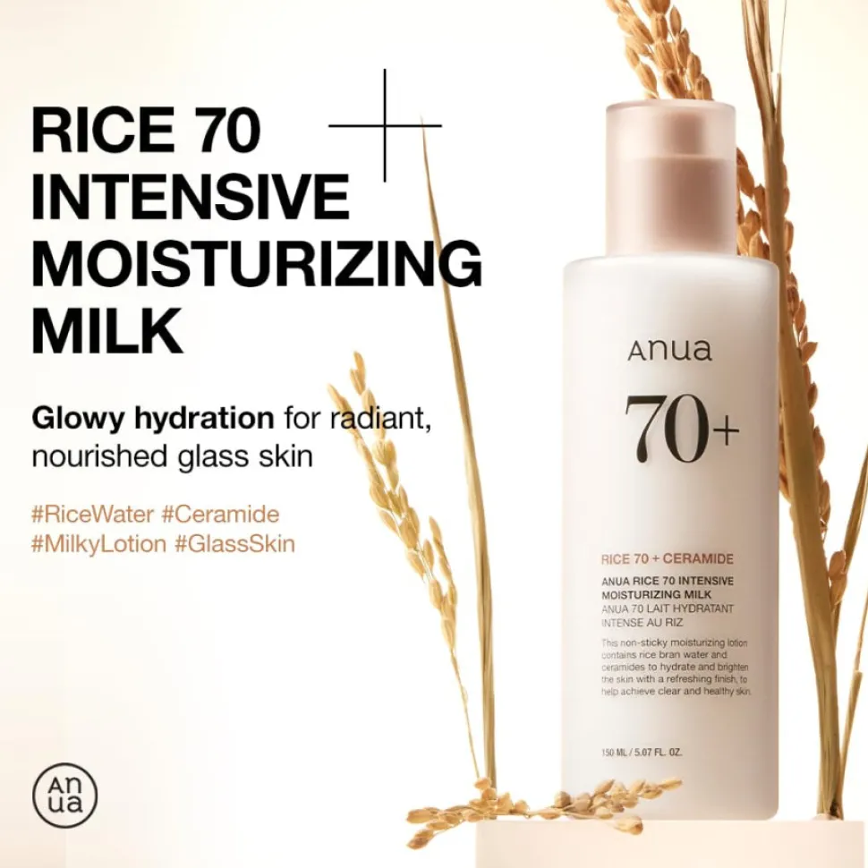 Anua Rice 70 Intensive Moisturizing Milk ihoa syväkosteuttava, vahvistava ja tasapainottava kevyt kosteusvoide / emulsiovoide kaikille ihotyypeille, etenkin samealle iholle tuomaan lasimaista hehkua – tämä hellävarainen kasvovoide sisältää ravitsevaa riisivettä ja -uutetta, kirkastavaa niasiiniamidia sekä ihon suojamuuria vahvistavia keramideja, jotka yhdessä auttavat edistämään väsyneen ihon kuulautta ja kirkkautta.
