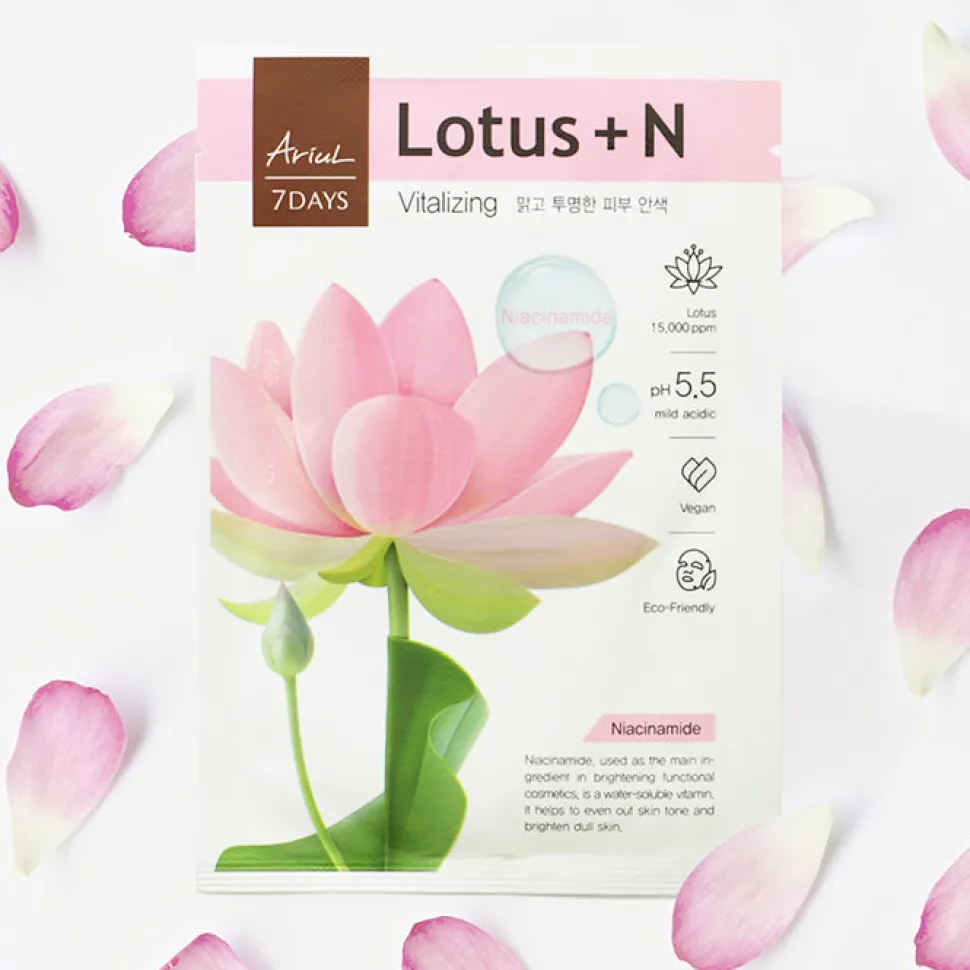 Ariul 7days Mask Lotus N on ihon sävyä tasoittava ja heleyttävä kangasnaamio, jonka pääainesosina toimivat lotuksen kukkauute ja niasiiniamidi. Kangasnaamio kirkastaa sameaa ihoa ja auttaa haalistamaan ihon tummentumia tai hyperpigmentaatiota.