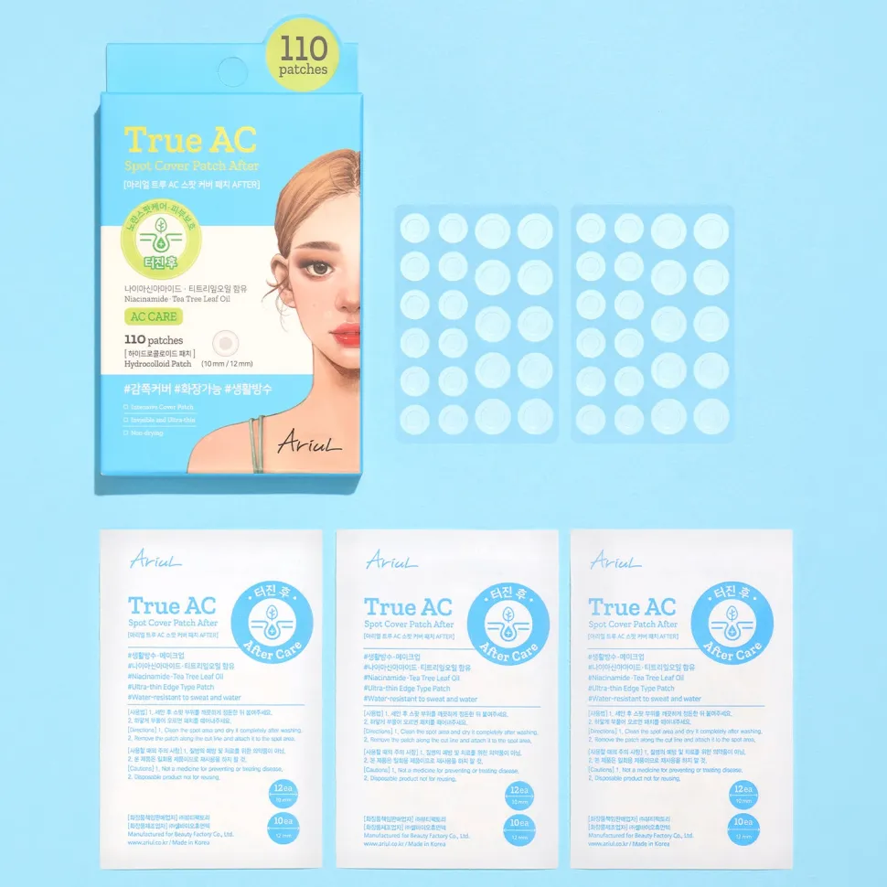 Ariul AC Cover Patch After sisältää yhteensä 110 kahta eri kokoista finnilaastaria (pimple patch) hoitamaan ärtyneitä ihonalaisia finnejä, sekä finnejä joihin on puhkeamisen yhteydessä muodostunut haava – nämä ohuet ja vettä/ hikeä hylkivät finnilaastarit sisältävät kirkastavaa niasiiniamidia ennaltaehkäisemään tumman aknearven muodostumista sekä teepuuöljyä auttamaan tulehduksen taltuttamisessa.