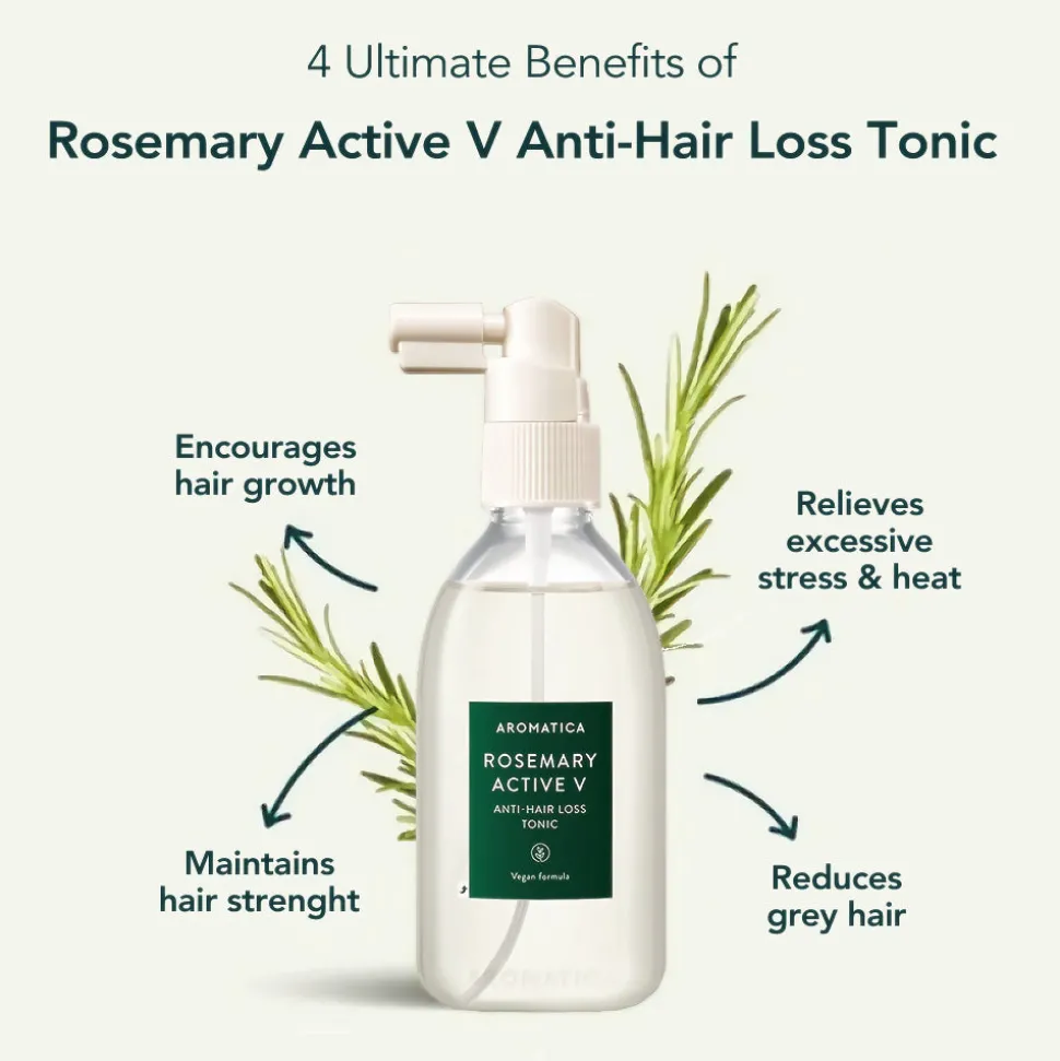 Aromatica Rosemary Active V Anti-Hair Loss Tonic on palkittu hiustenkasvua edistävä hiuspohjan hoitoneste etenkin hennoista hiuksista, hiustenlähdöstä ja kuivasta päänahasta kärsiville – tämä vahvistava hoitoneste auttaa ravitsemaan herkkää hiuspohjaa tarjoten samalla raikkaan viilentävän efektin!