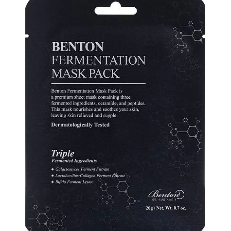 Benton Fermentation Mask Pack on sameaa ihoa kirkastava kangasnaamio. Sen sisältämät fermentoidut ainesosat, keramidit ja peptidit auttavat palauttamaan ihon kimmoisuuden ja kuulauden. Naamio auttaa myös häivyttämään hienoja juonteita.