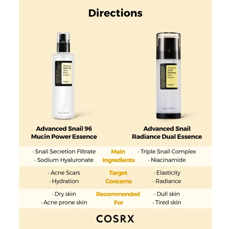 Cosrx -brändin supersuositun etanasarjan uutuustuote Advanced Snail Radiance Dual Essence -hoitoneste on täällä! Tässä uniikissa kahtia jaetussa tuplahoitonesteessä sekoittuu tutun -hoitonesteen ihoa hellivän etanaseerumin lisäksi kirkastava niasiiniamidi.