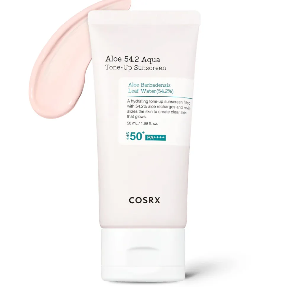 Cosrx Aloe 54.2 Aqua Tone-Up Sunscreen on hellävarainen SPF50+ / PA++++ suojakertoimen sävyttävä kemiallinen aurinkovoide kaikille ihotyypeille, myös herkälle iholle, jonka persikkaisen tone up sävyn avulla luot luonnollisen heleän ihon ilman tarvetta pohjameikille – tämä mieto aurinkovoide tuntuu kasvoilla ilmavan kevyeltä, imeytyen iholle nopeasti ilman tahmaista tai öljyistä tunnetta!