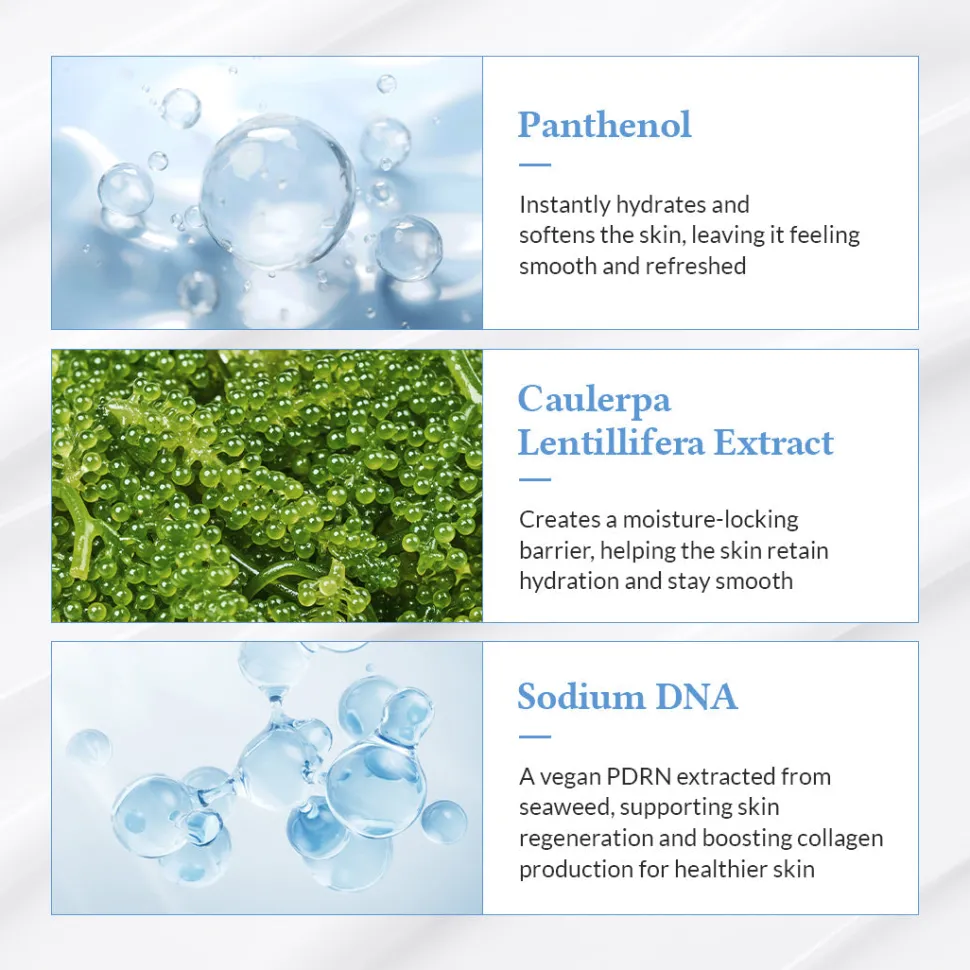 Koostumuksessa yhdistyvät bambuvesi, joka tukee ihon uudistumista ja auttaa ylläpitämään kirkasta ja heleää ilmettä, sekä vegaaninen merileväpohjainen PDRN ja merirypäleuute, jotka kosteuttavat intensiivisesti ja edistävät ihon suojamuurin vahvistumista. Sisältää myös pantenolia, jonka rauhoittava vaikutus joka lievittää ärsytystä ja vahvistaa ihon suojamuuria.