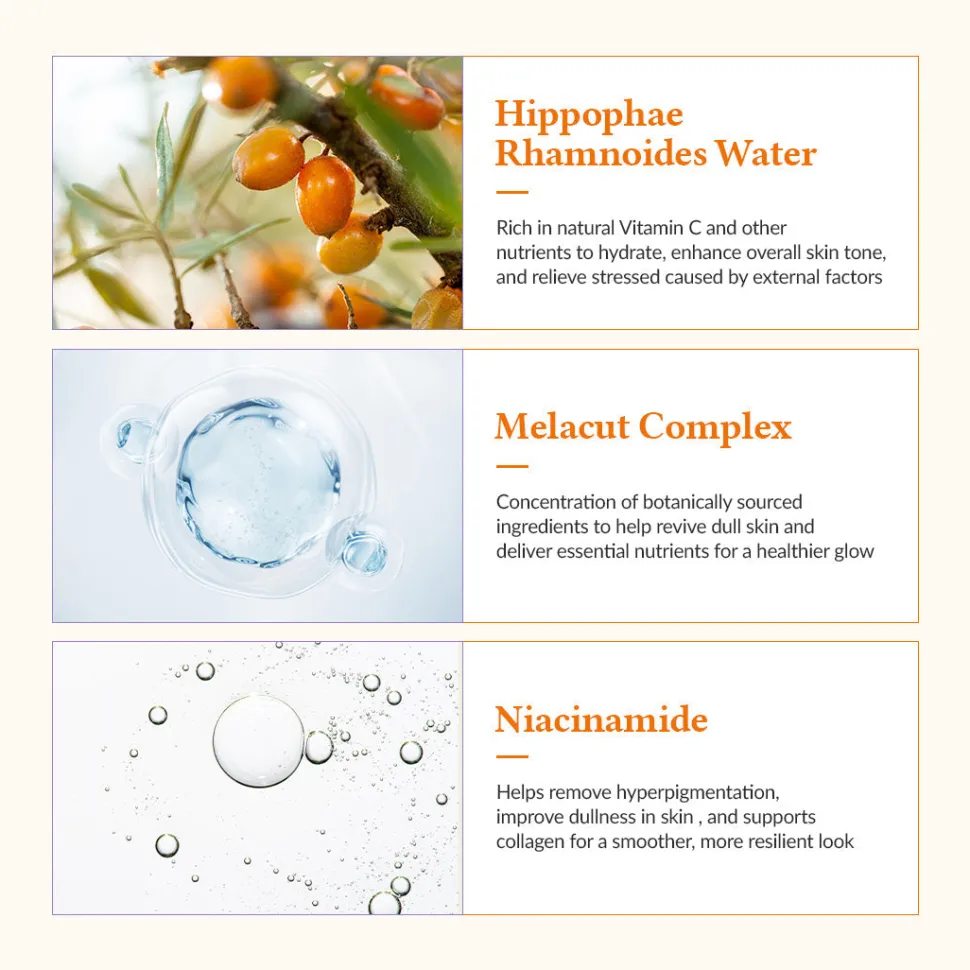 Koostumus sisältää luonnollista C-vitamiinia runsaasti sisältävää tyrnivesiuutetta (Hippophae Rhamnoides Water), niasiiniamidia sekä Melacut Complex -yhdistelmää, jotka yhdessä vähentävät hyperpigmentaatiota, tasoittavat ihon sävyä ja tukevat kollageenin tuotantoa. Lisäksi hyaluronihappo ja ravitsevat kasviuutteet kosteuttavat ja suojaavat ihoa samalla ylläpitäen sen kosteustasapainoa.
