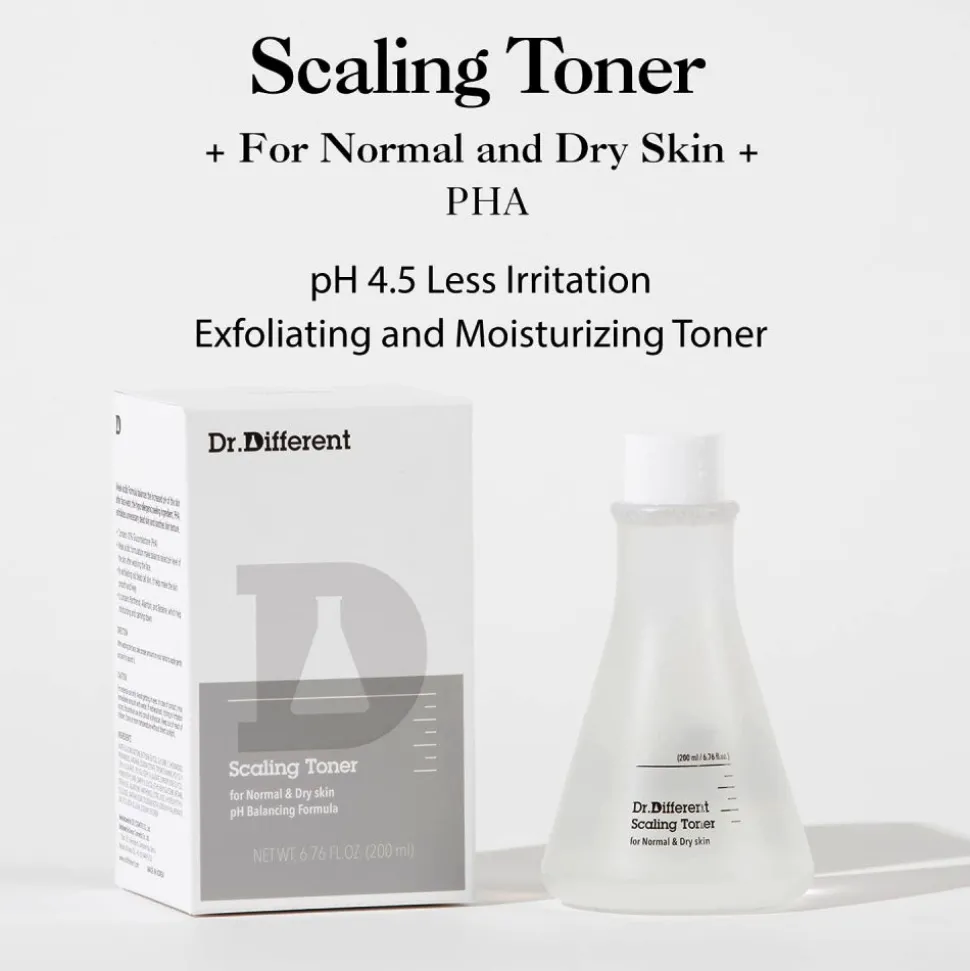 Dr.Different Scaling Toner (Normal & Dry Skin) on hypoallergeeninen ihoa kosteuttava ja kuoriva kasvovesi, joka pehmentää karheaa ihoa hellävaraisen PHA -hapon avulla. Soveltuu kaikille ihotyypeille, etenkin normaalille- ja kuivalle iholle, joka ei yleensä kestä kemiallisesti kuorivia tuotteita.
