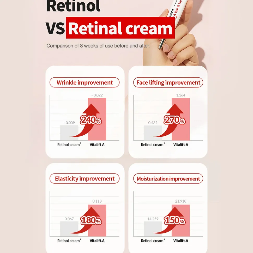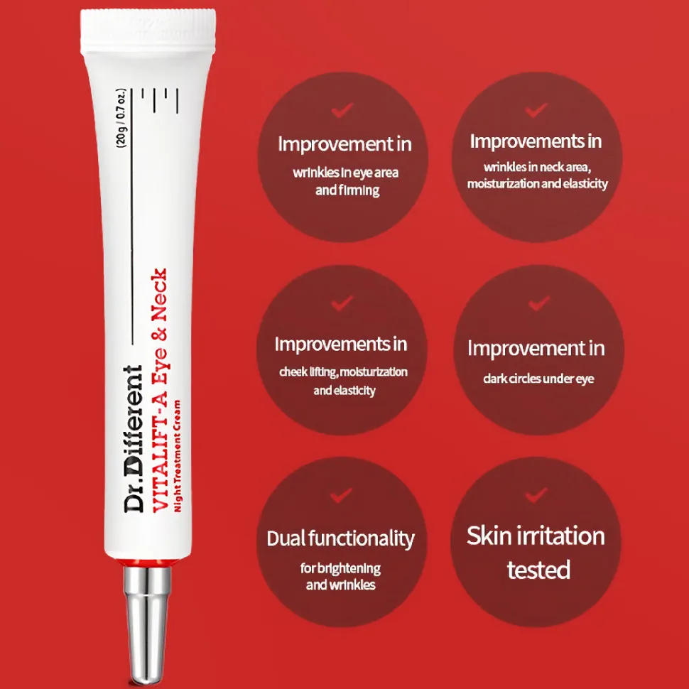 Dr.Different VITALIFT-A Eye & Neck on ihon joustavuutta edistävä, kiinteyttävä ja kirkastava 0.025% retinalia sisältävä silmänympärysvoide / kaulavoide kaikille ihotyypeille, etenkin ikääntyvälle iholle.