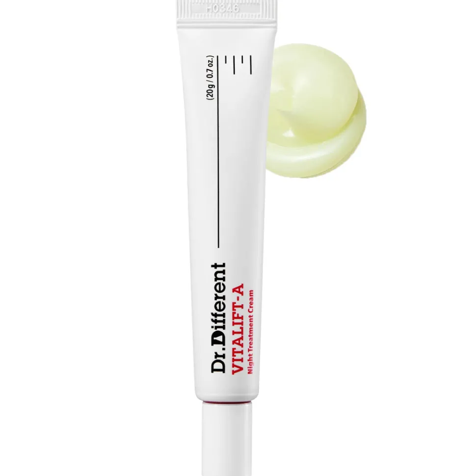 Vuoden 2020 Glowpick Awards parhaaksi yövoiteeksi palkittu Dr.Different VITALIFT-A on ihon joustavuutta edistävä, ravitseva ja kirkastava 0.05% retinalia sisältävä yövoide kaikille ihotyypeille, etenkin ikääntyvälle iholle joka kärsii karheasta tekstuurista ja pigmenttimuutoksista. VITALIFT-A -yövoide auttaa tehokkaasti häiventämään ja ennaltaehkäisemään juonteita, pehmentämään ihon tekstuuria, kirkastamaan pigmenttimuutoksita, sekä luomaan ihosta täyteläisemmän ja elinvoimaisemman.