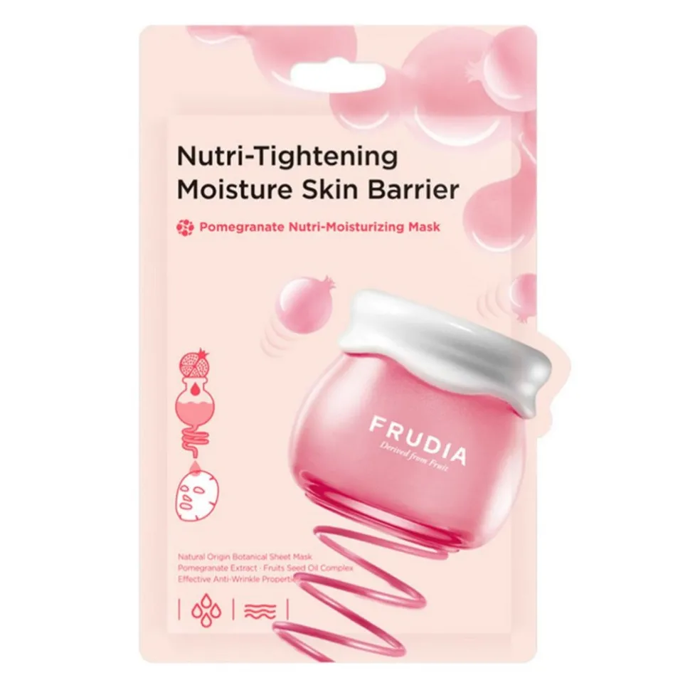 Frudia Pomegranate Nutri-Moisturizing Mask -kangasnaamio sisältää ravinteikasta granaattiomenan uutetta (46%), joka on täynnä polyfenoleita. Tuote auttaa tekemään ihosta kosteutetun ja vahvistaa sekä suojaa sitä ulkoisilta ärsykkeiltä.