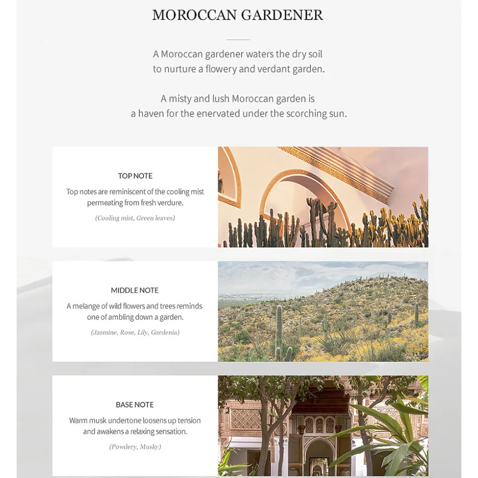 Rentoudu kukoistavan marokkolaisen puutarhan aamukasteessa Huxleyn Moroccan Gardener -parfyymin matkassa – tässä ylellisessä hajuvedessä yhdistyvät villikukkien, kosteiden viherkasvien ja lämpimän myskin pehmeät tuoksut, jotka tuovat kesän ihollesi ♡